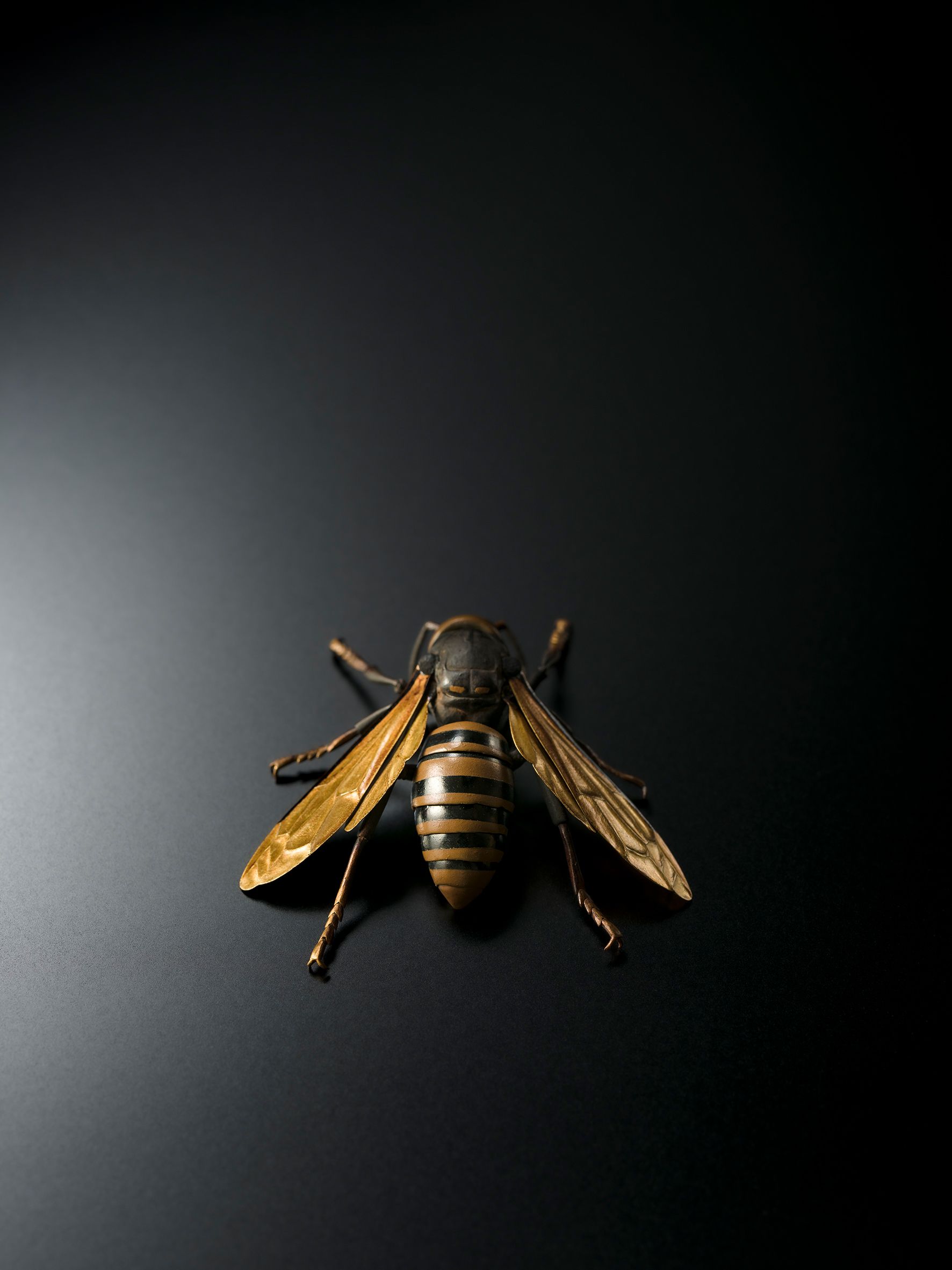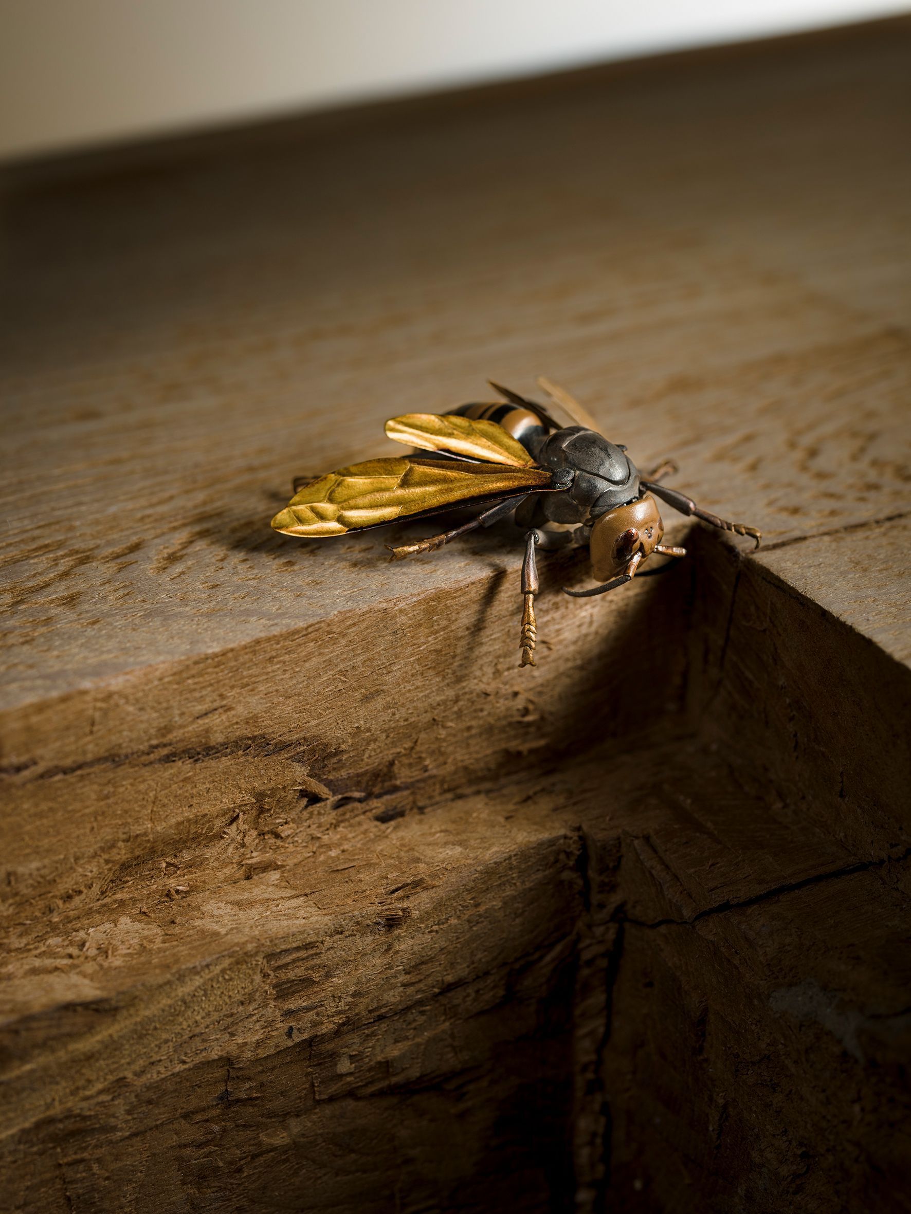 art of a series of works using various rarefied metal-working techniques to create detailed replicas of various insects, with both moving joints and wings. This is a kind of wasp.