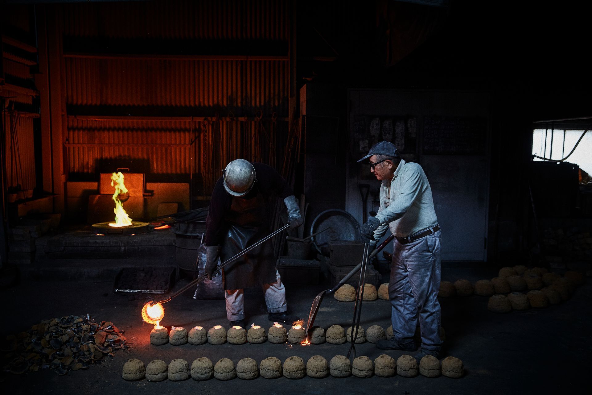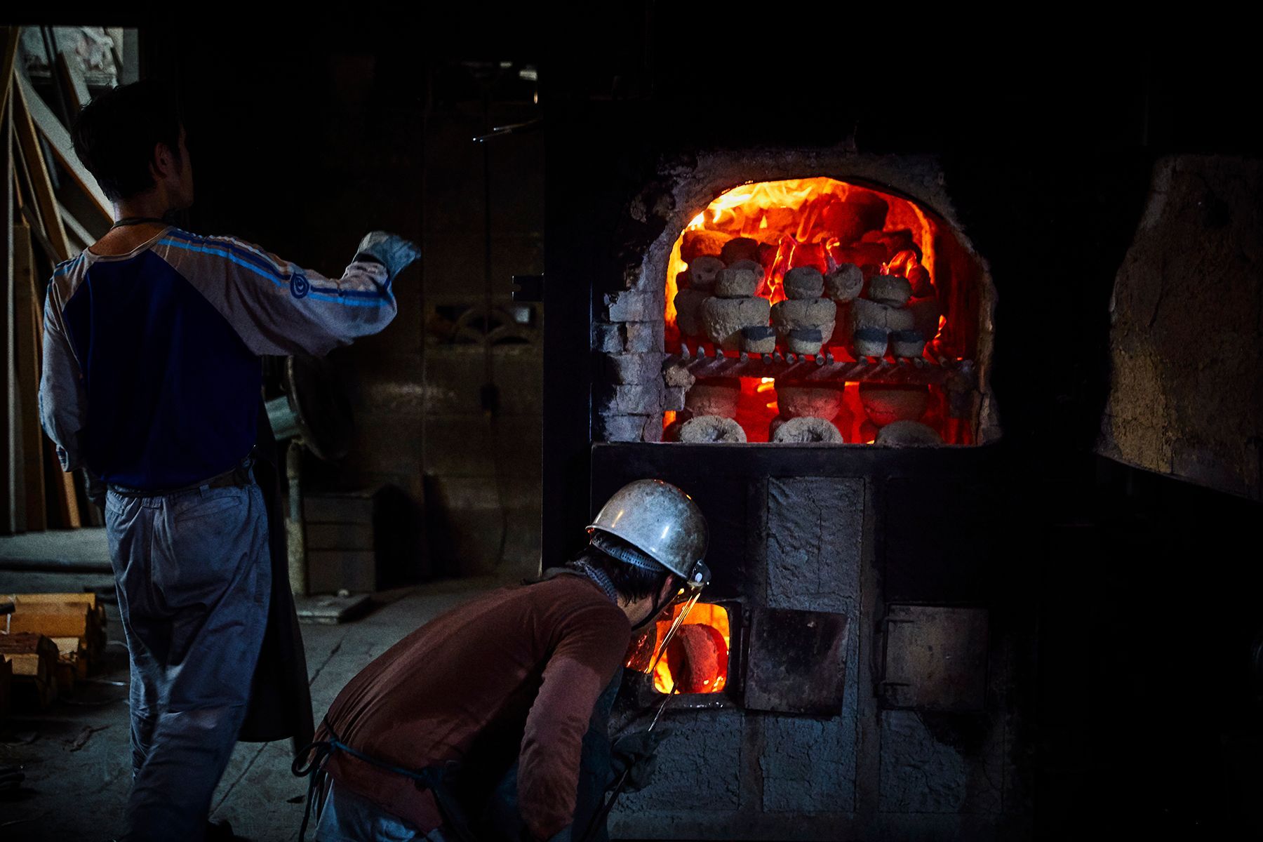 ButtonFiring the mold with firewood enables the casting of "Sahari"—Nanjo Kobo original alloy blend—according to the workshop’s unique composition ratio.