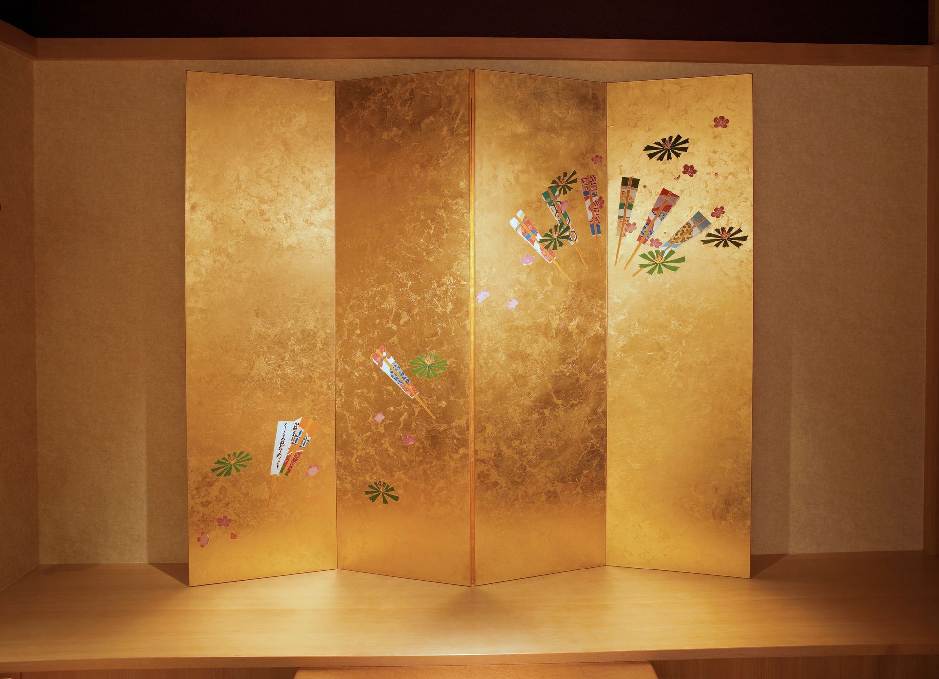 Hisatsune uses a modified yuzen technique to apply the color onto a gold leaf background.