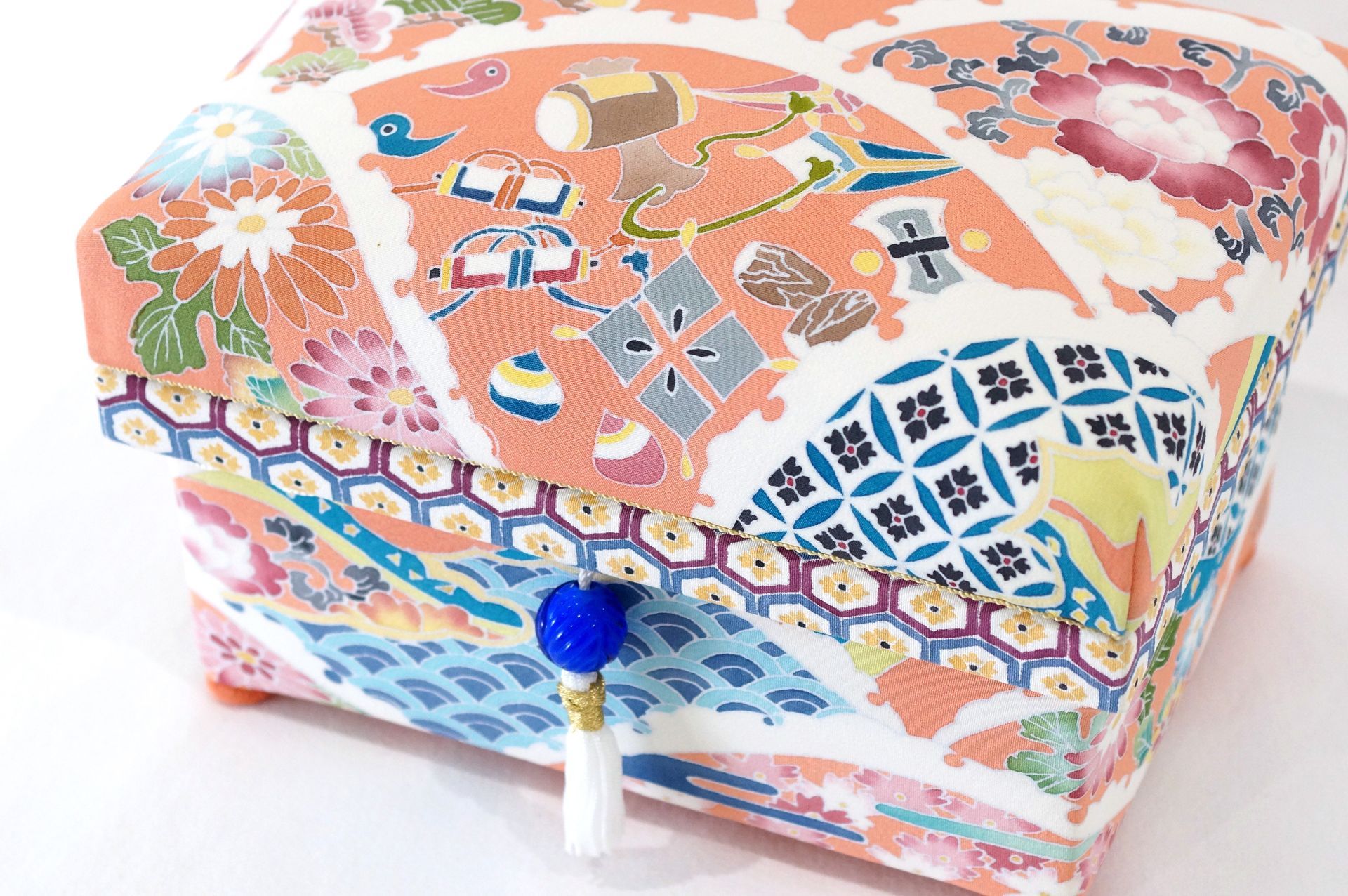 First, the yuzen process is used to create the decorative pattern onto crepe silk. Then the silk is cut and applied as the outer surface of these boxes.