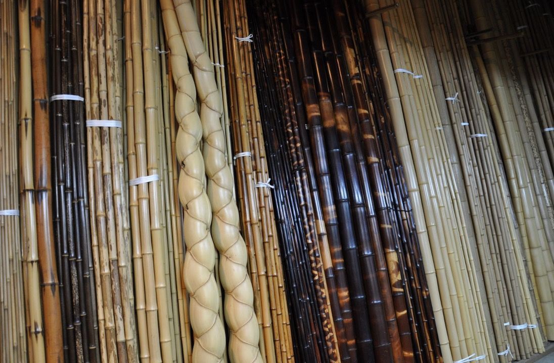 Over 100 different types of bamboo poles and bamboo products are available at Takehei’s large storage facility. Varieties range from common, conventional bamboo to rare and exotic types, some up to 200 years old.