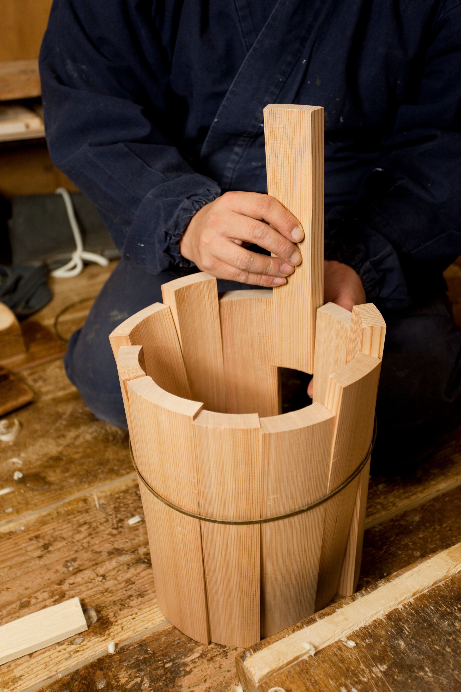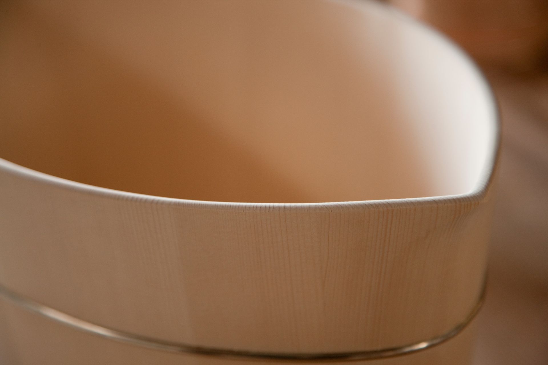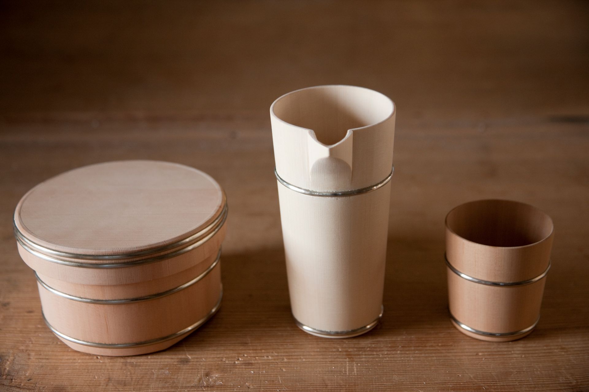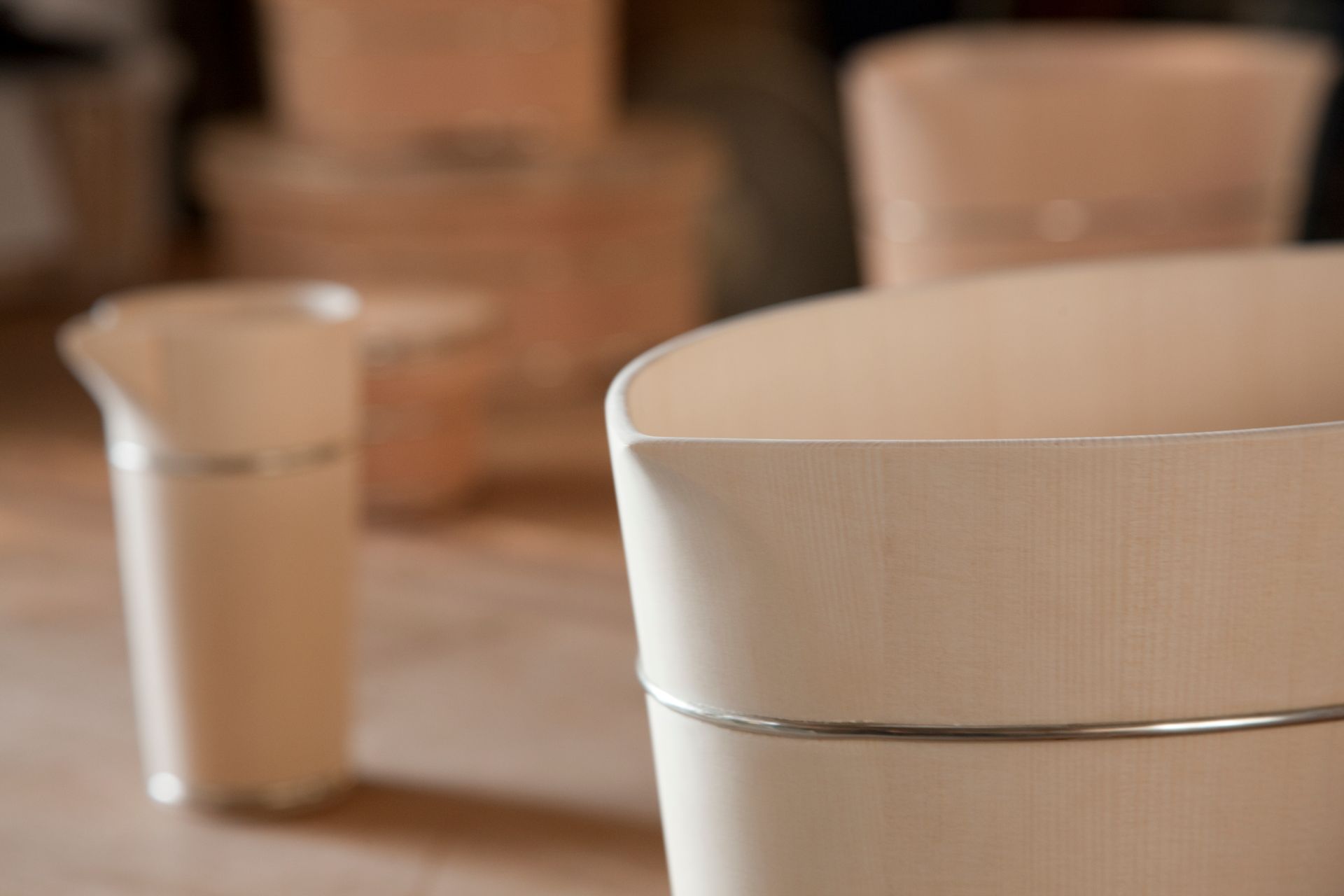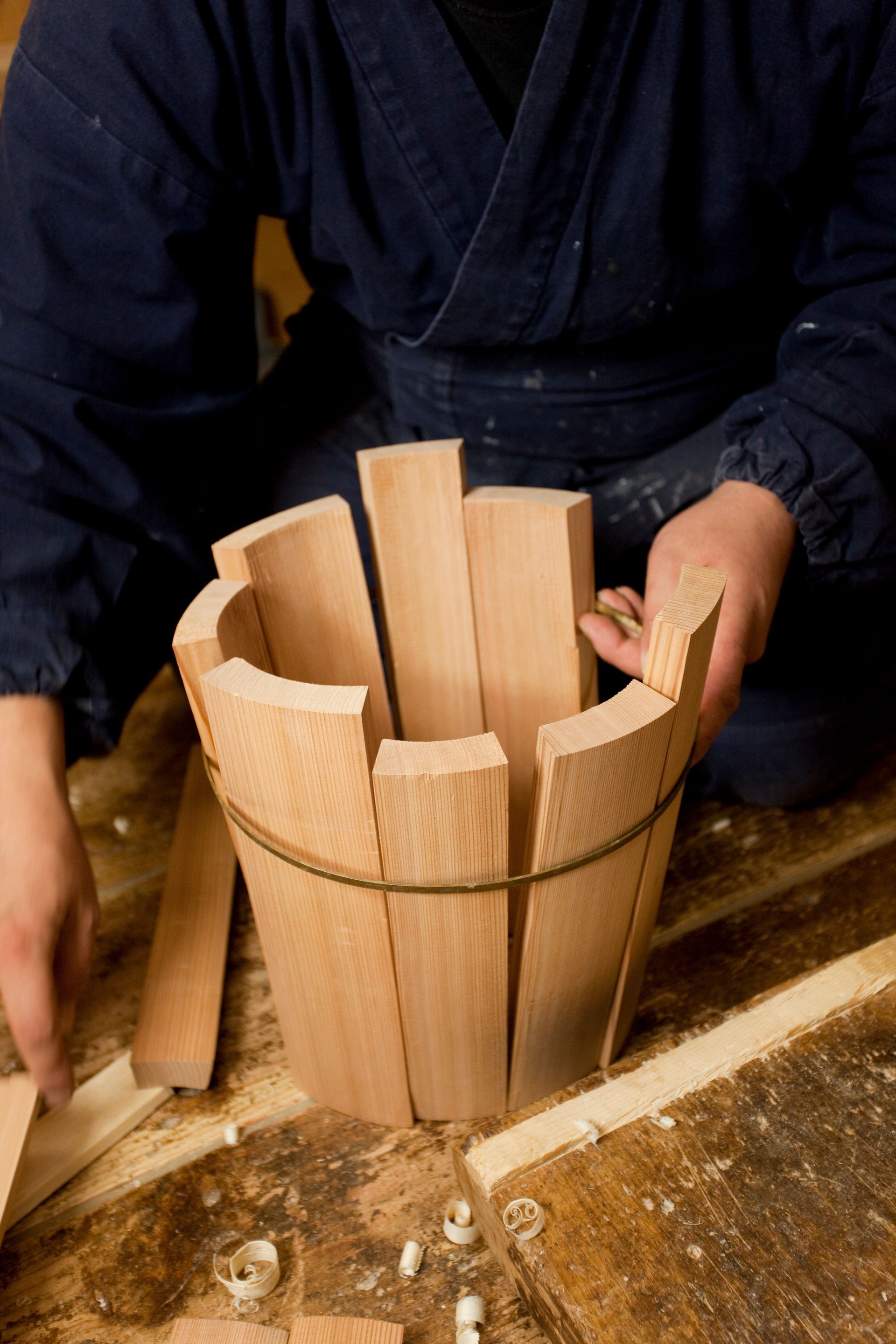 The oke is a wooden bucket that has been used in Japan for daily domestic purposes such as bathing, storage and preparation of food for over 700 years. These durable cypress or cedar containers are made up of curved pieces of wood held in shape with metal hoops placed at the top and bottom, resulting in a seamless surface.