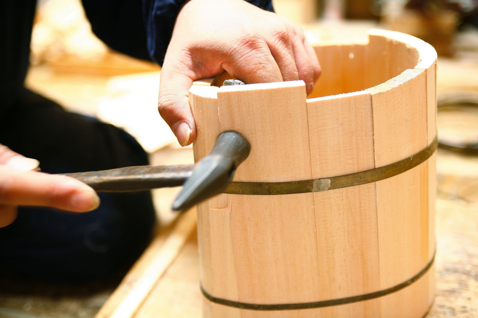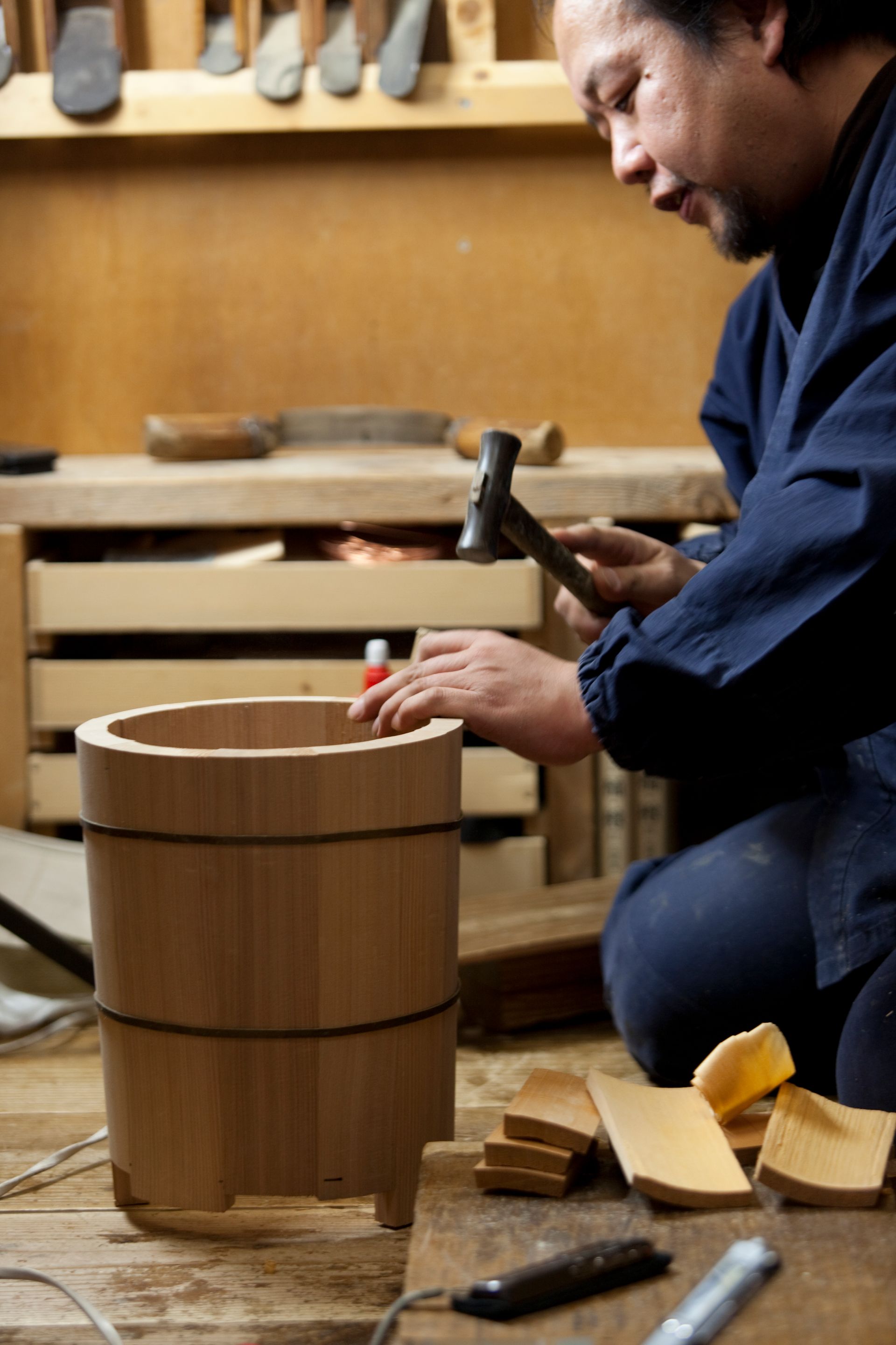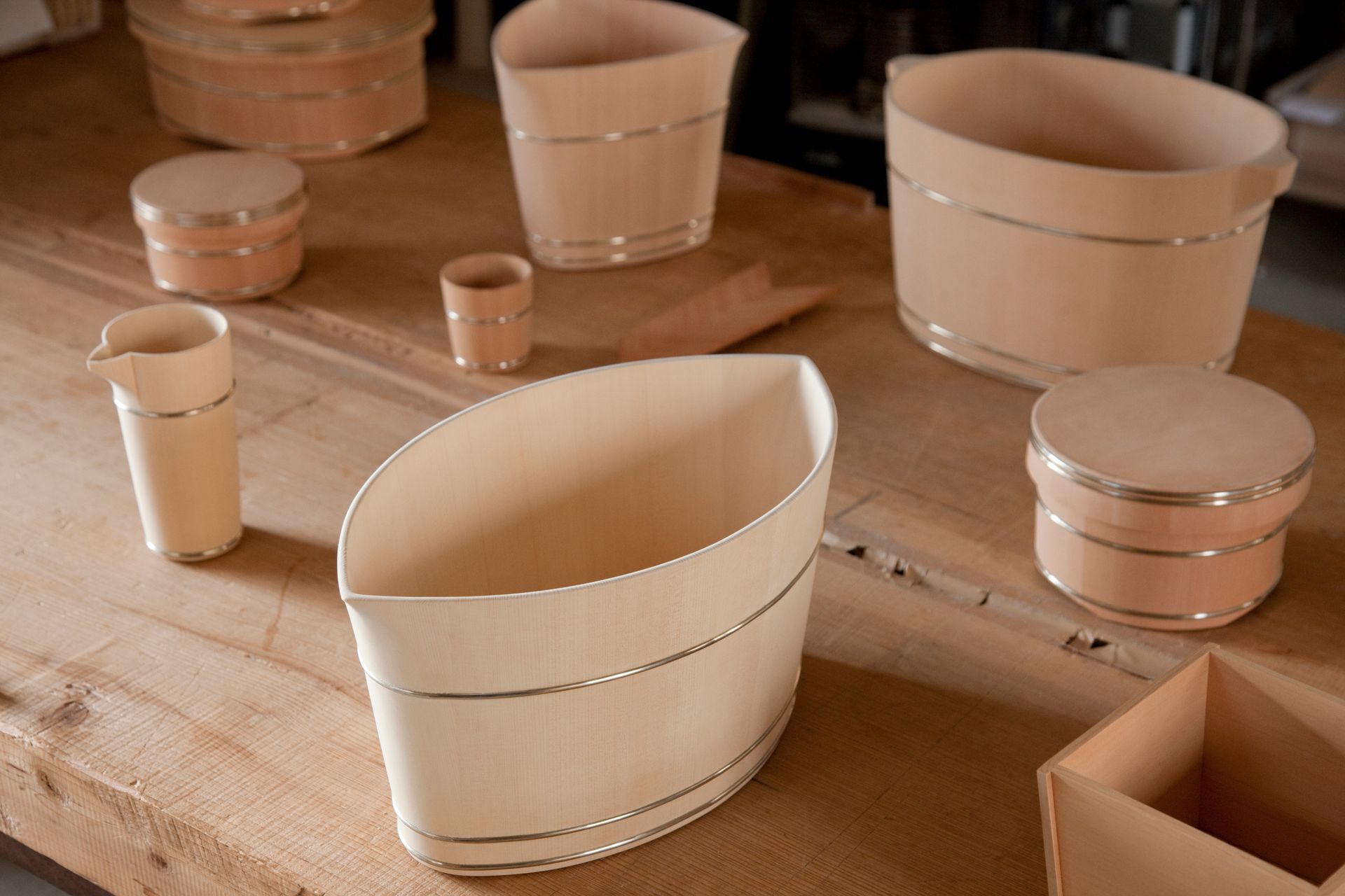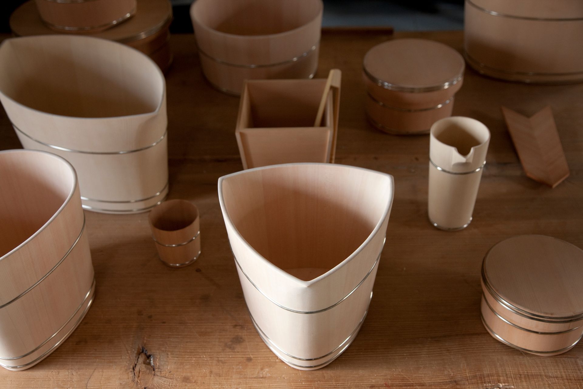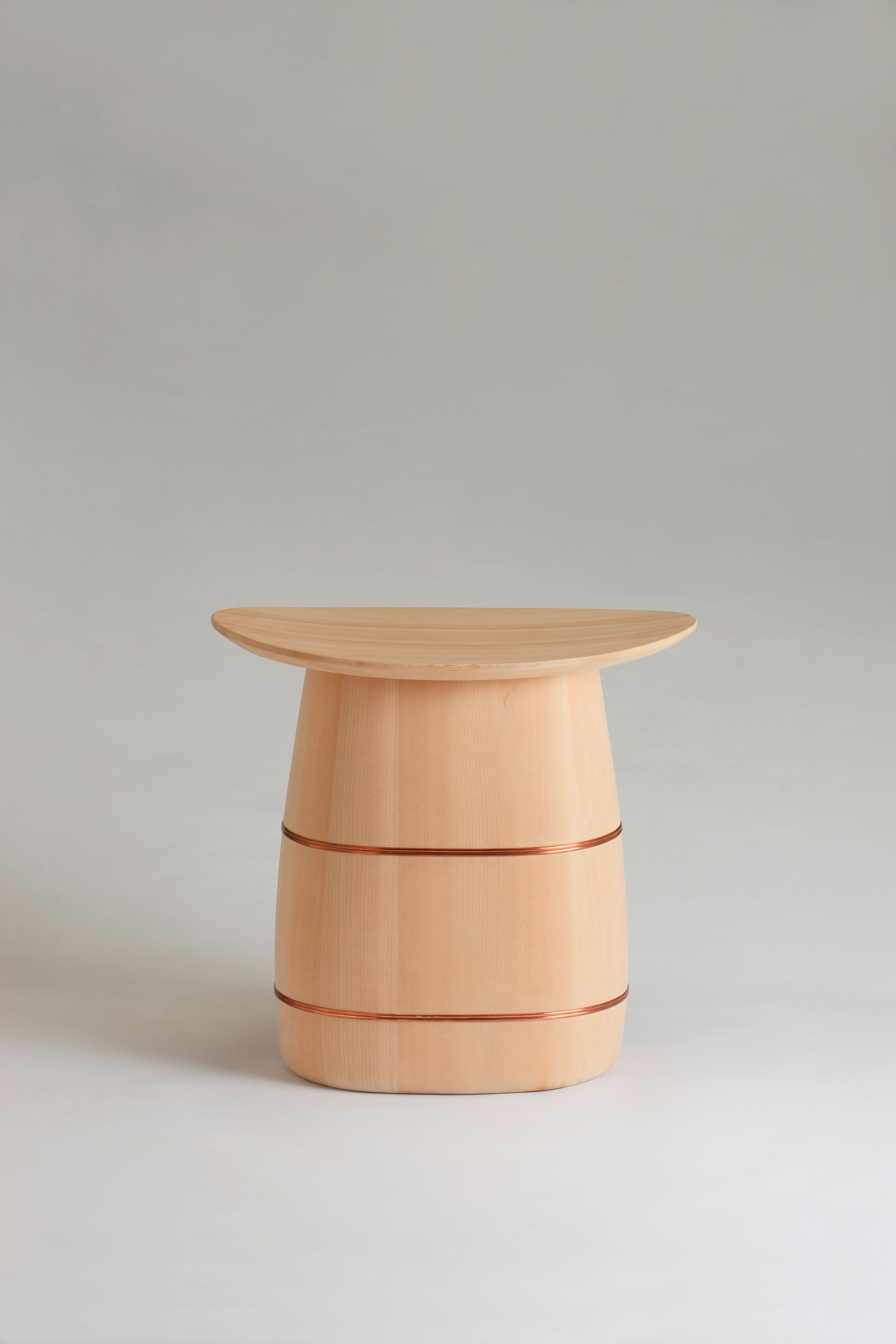 The oke is a wooden bucket that has been used in Japan for daily domestic purposes such as bathing, storage and preparation of food for over 700 years. These durable cypress or cedar containers are made up of curved pieces of wood held in shape with metal hoops placed at the top and bottom, resulting in a seamless surface.