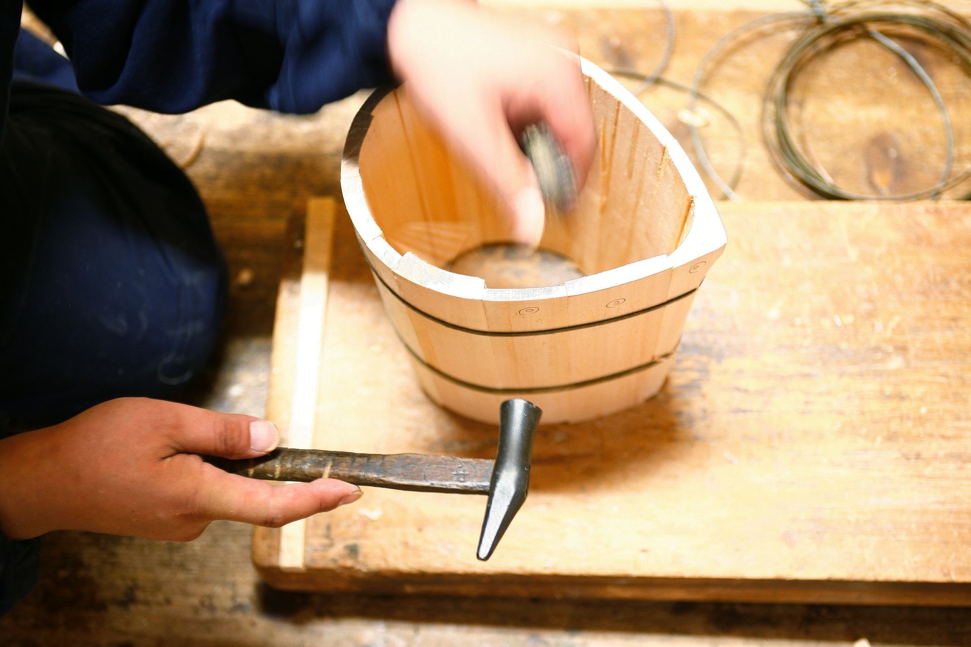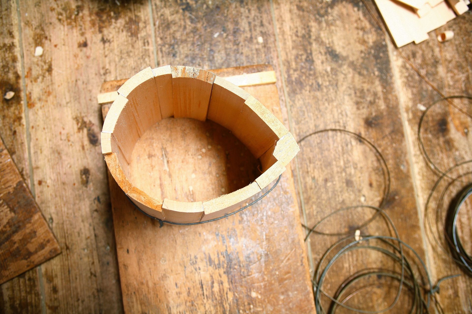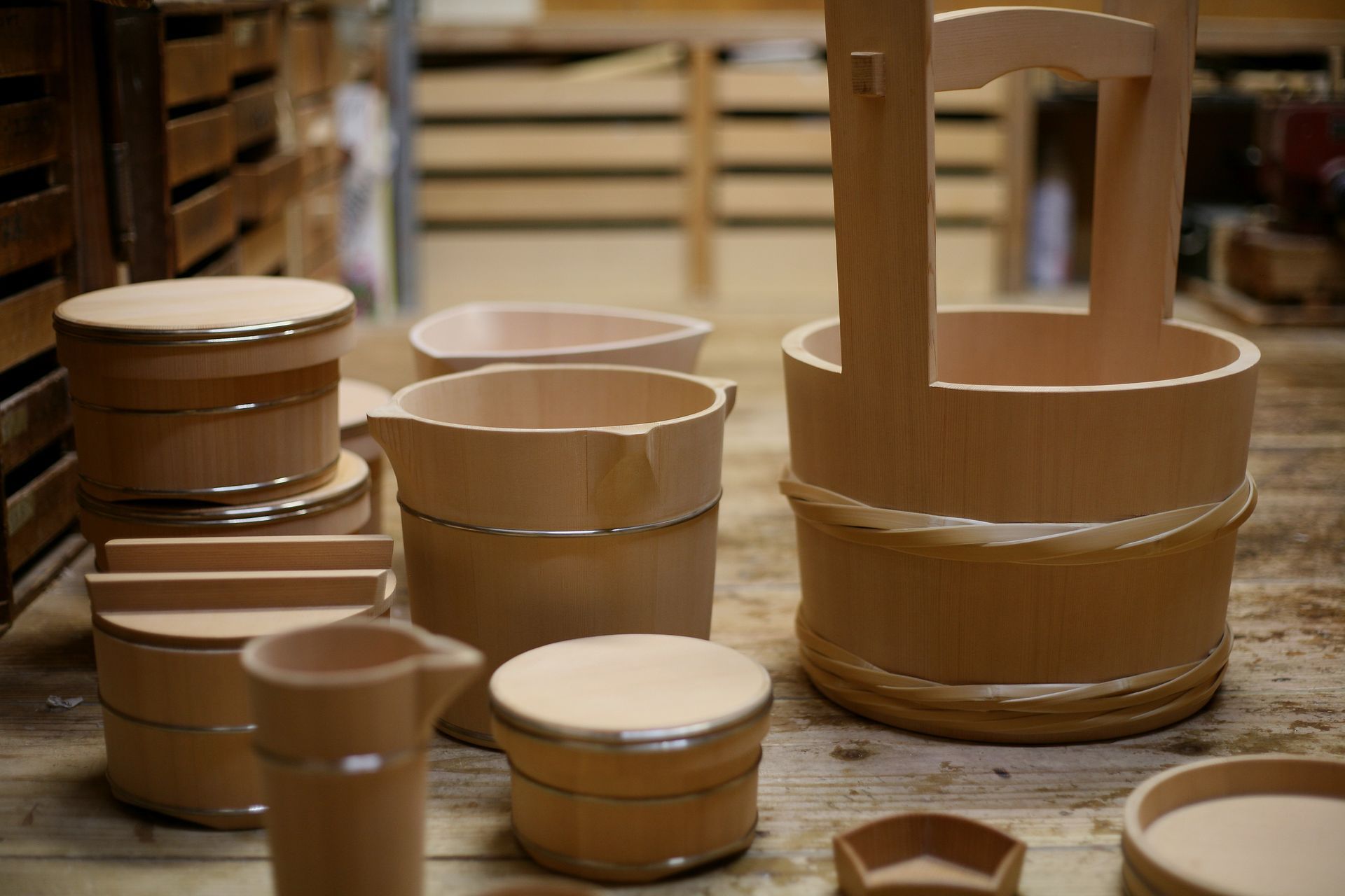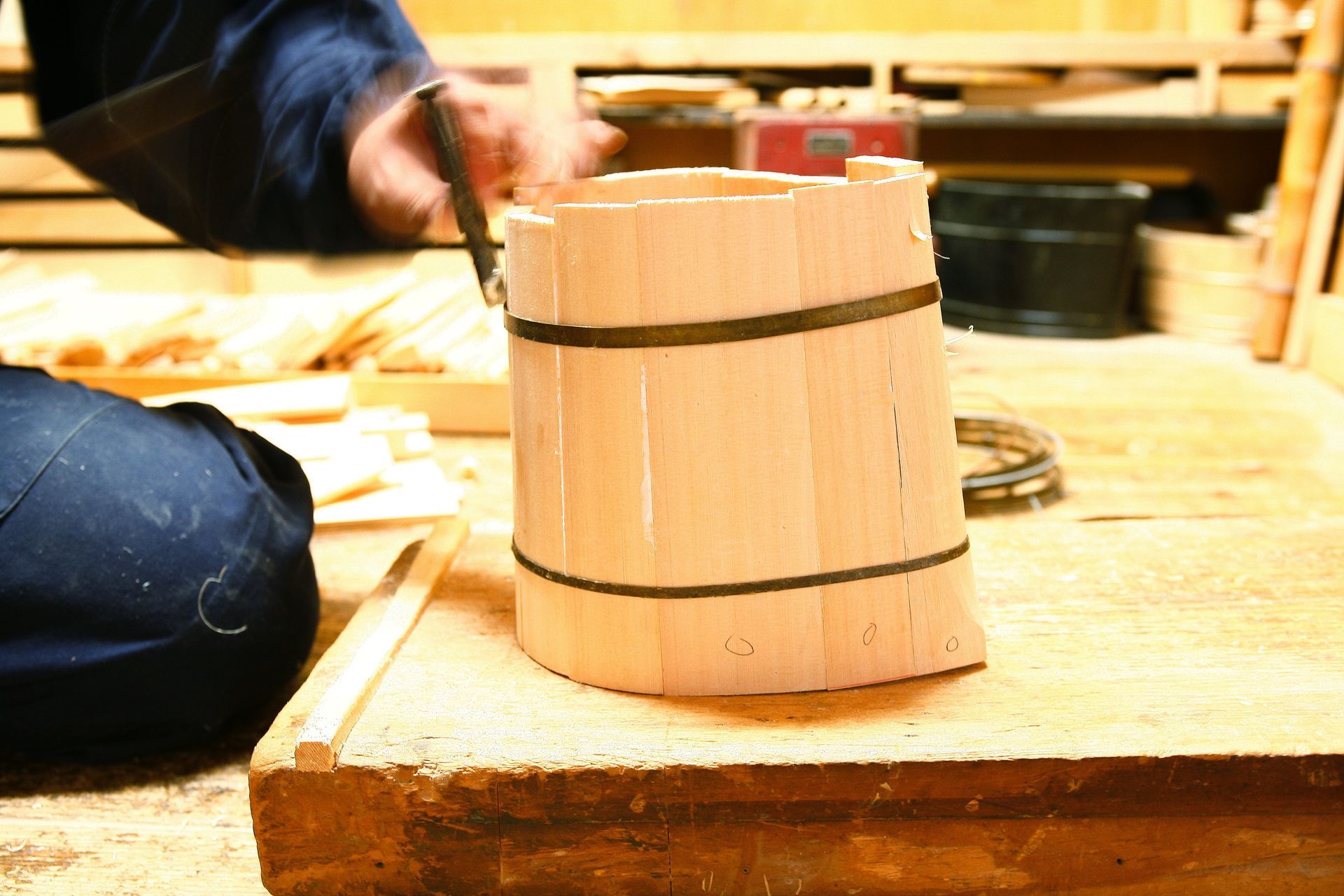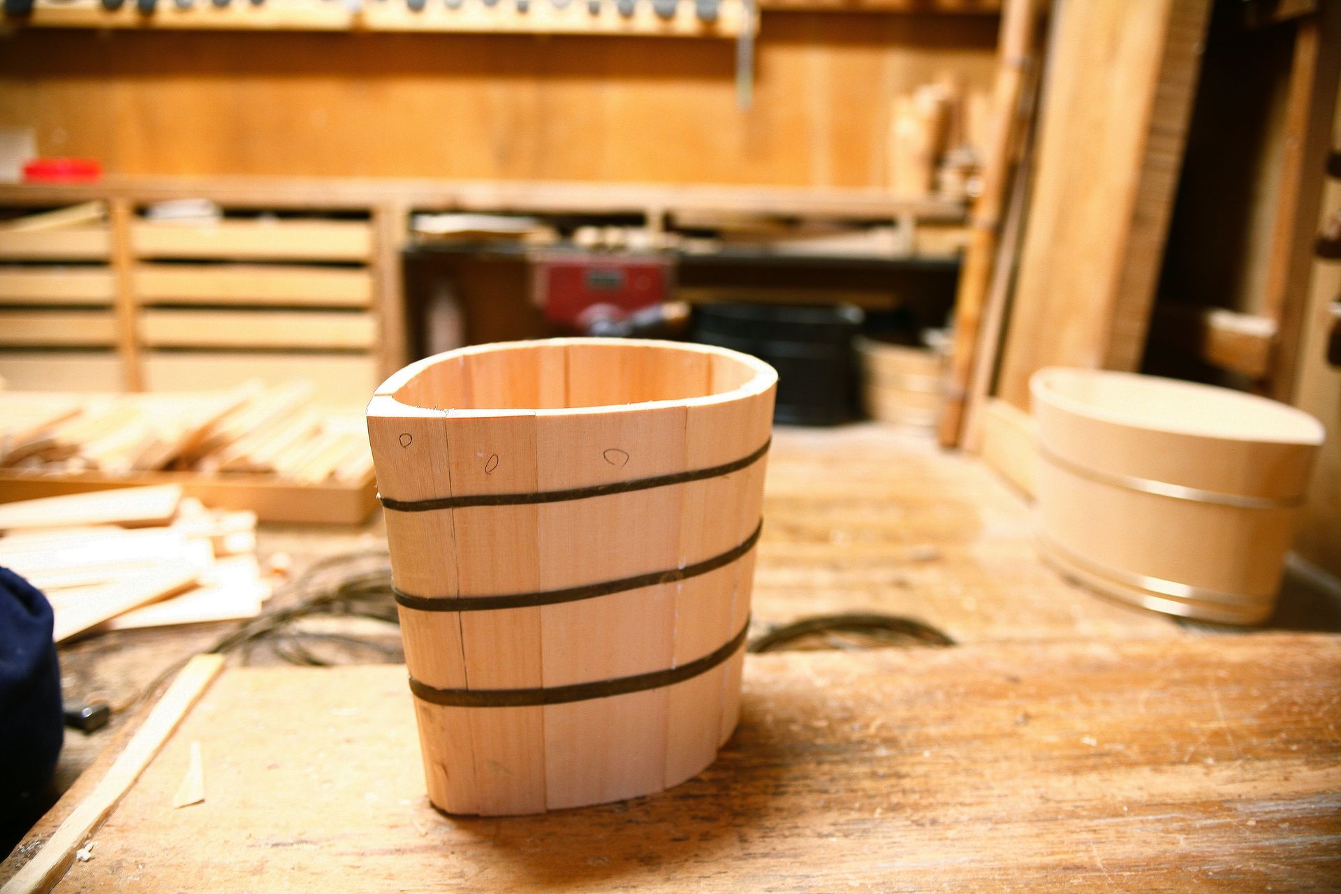 The oke is a wooden bucket that has been used in Japan for daily domestic purposes such as bathing, storage and preparation of food for over 700 years. These durable cypress or cedar containers are made up of curved pieces of wood held in shape with metal hoops placed at the top and bottom, resulting in a seamless surface.