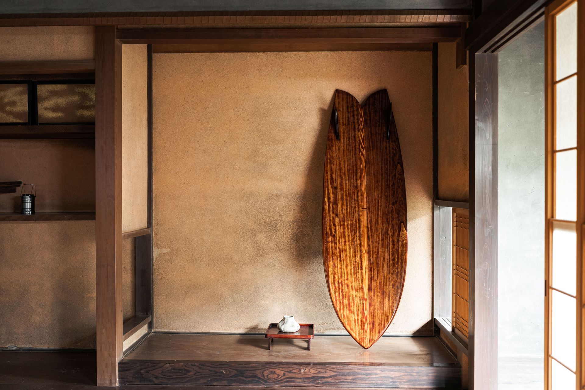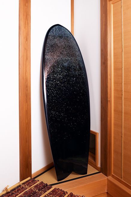 A paulownia wooden surfboard coated with many layers of translucent urushi lacquer, for a deep mirror-like shine.