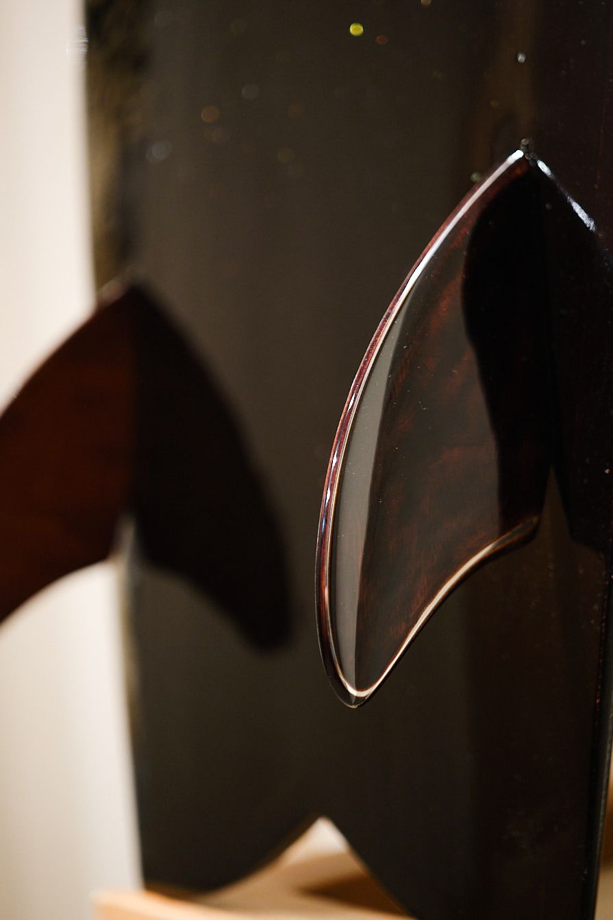 ButtonThe fins of a wooden surfboard coated with many layers of translucent urushi lacquer, for a deep mirror-like shine.