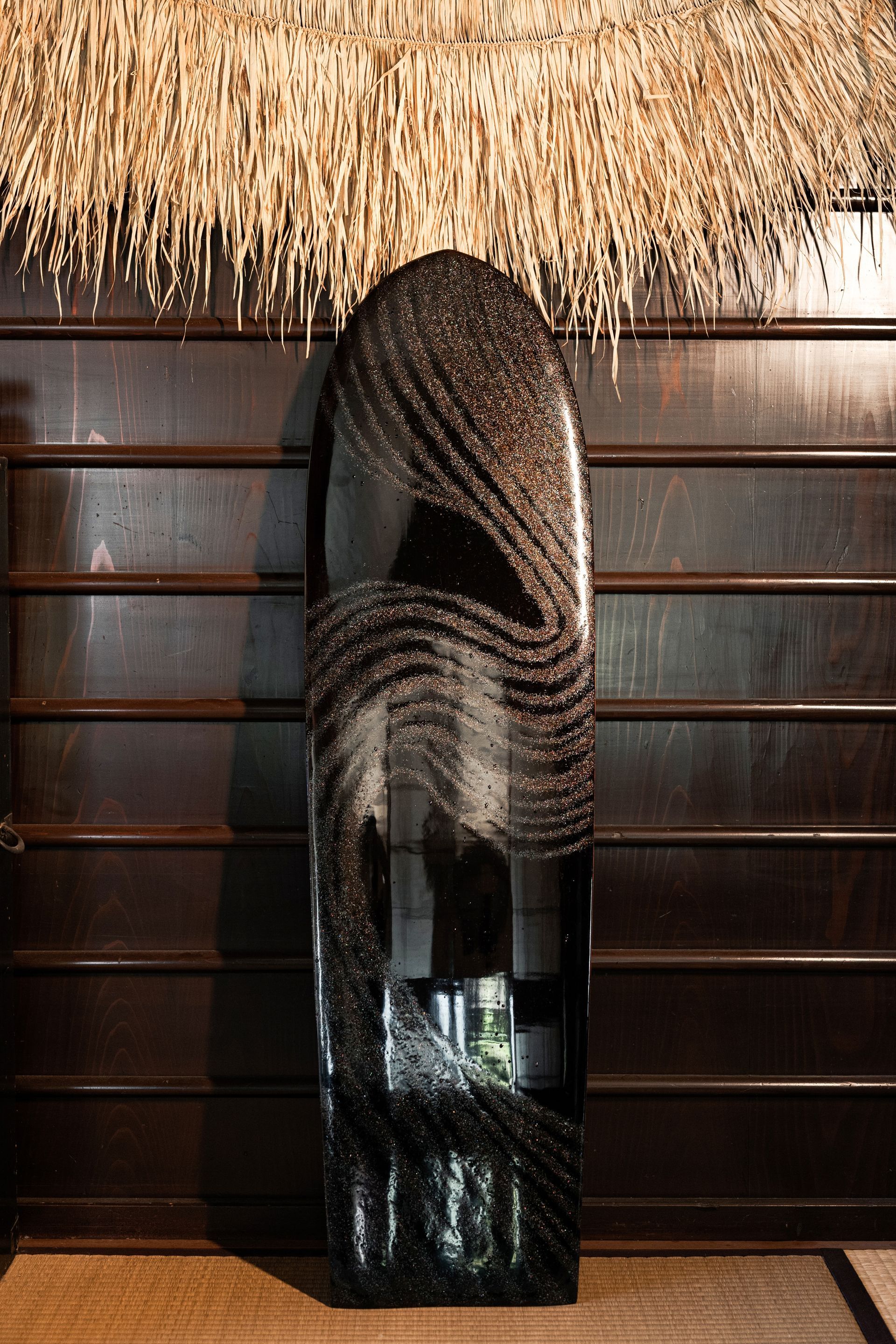 This surfboard was constructed with native Japanese paulownia wood, known for the greatest strength-to-weight ratio of any commercially used wood in the world. The wooden board is then coated with layers of thick, precious urushi lacquer paste. Finally, seashell is embedded into the still wet urushi, creating an original mother-of-pearl surfboard.
