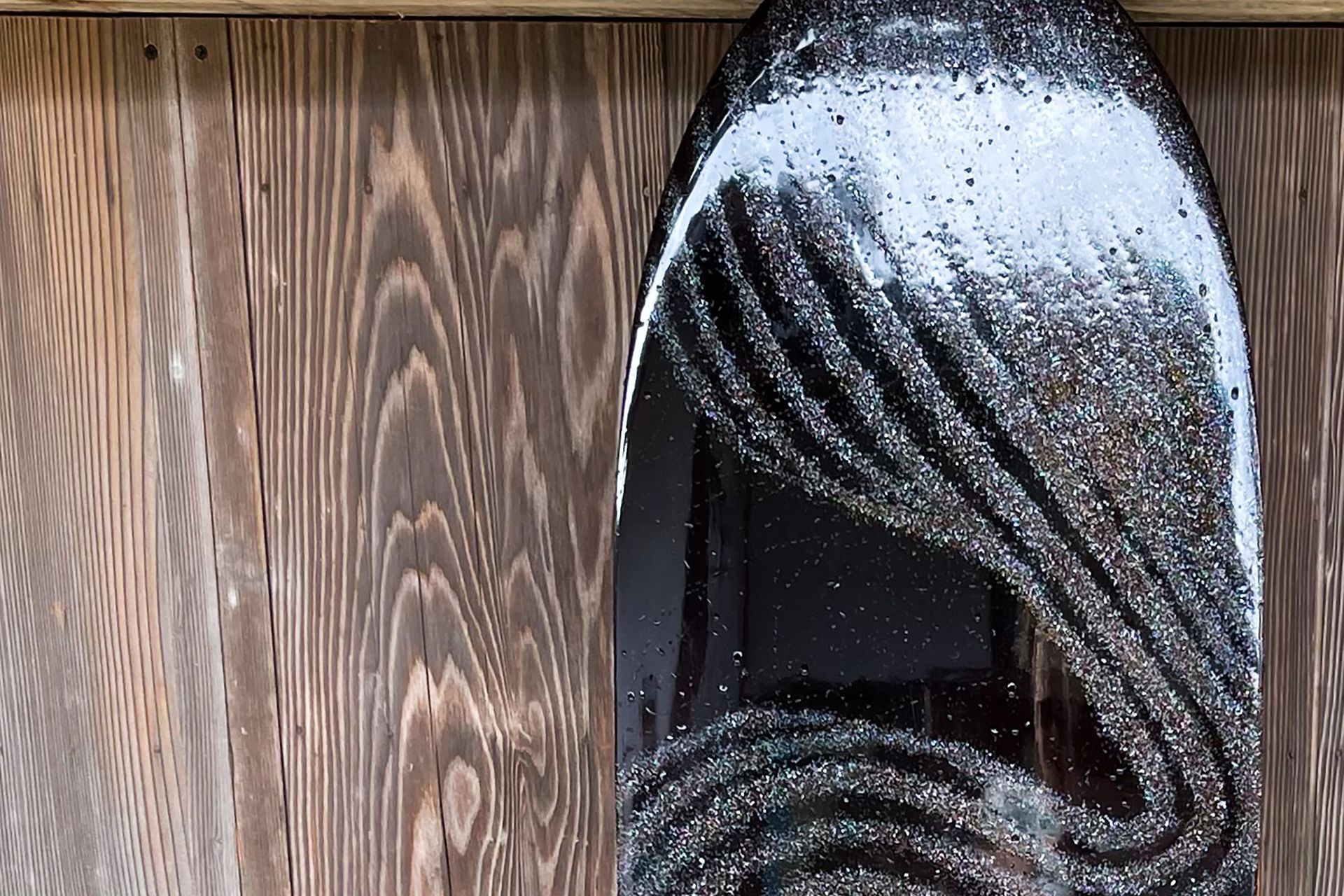 ButtonA close-up view of the Paulownia wooden surfboard coated with layers of thick, urushi lacquer paste and embedded with seashell set in a wave pattern on this original mother-of-pearl surfboard.