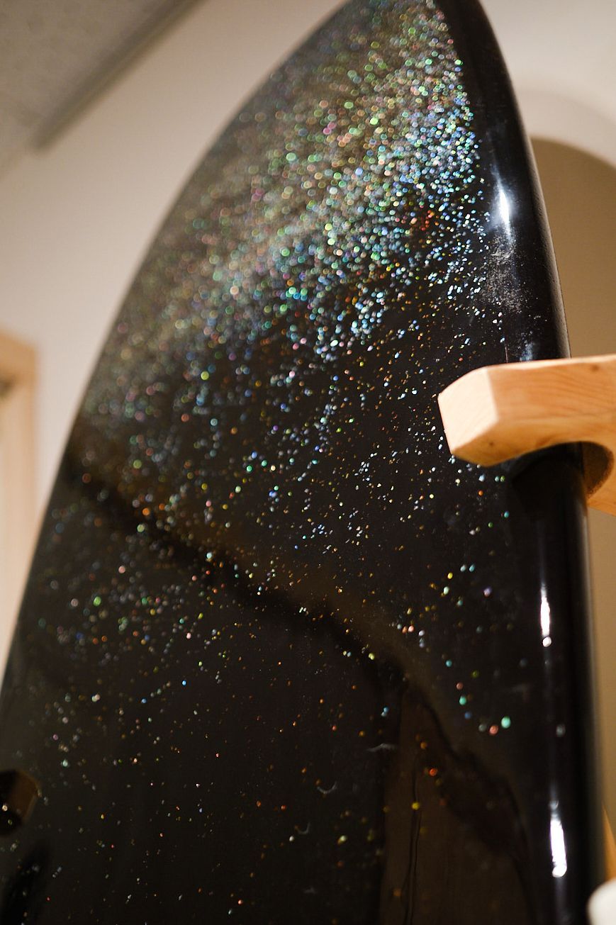 ButtonAnother view of the main image above. Paulownia wooden surfboard coated with layers of thick, urushi lacquer paste and embedded with seashell resulting in an original mother-of-pearl surfboard.