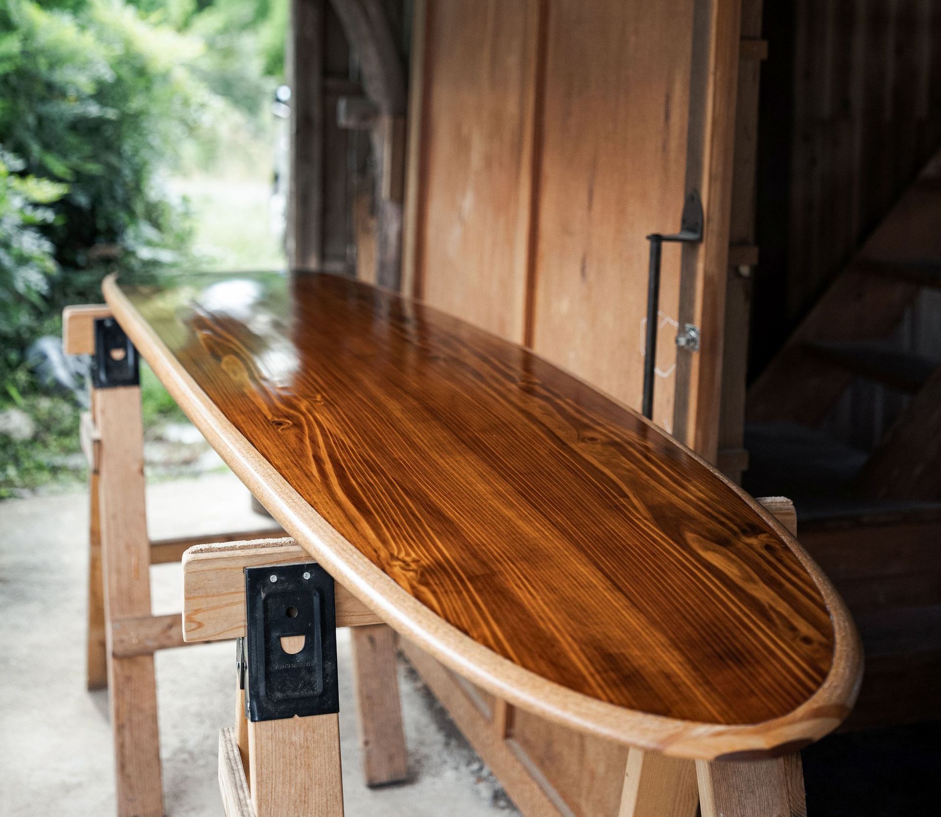 Using domestically grown Paulownia and Japanese cedar, the surfboards are not only lightweight, but when coated with Japanese urushi 漆 (lacquer) they last longer, are more durable and are easier to repair than conventional chemical-based boards. Tested by surfers internationally, these boards have even been found to surf better.
